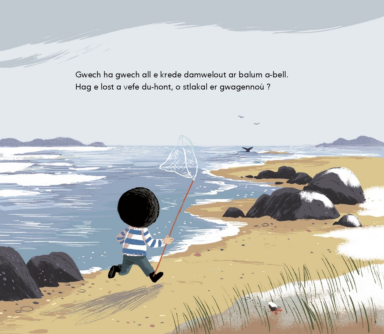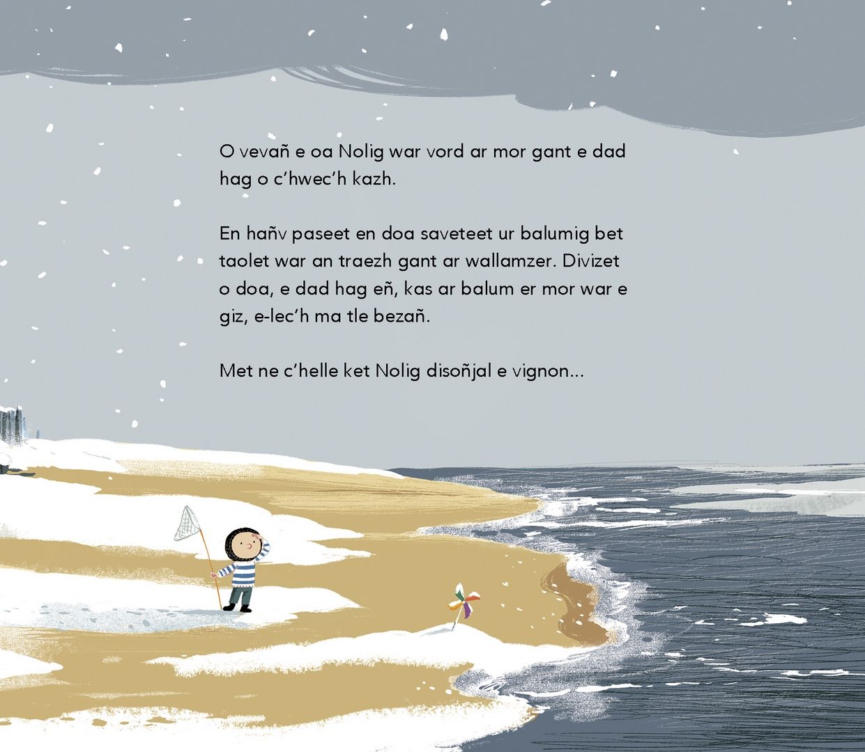On retrouve Nolig, le héros de « Ar balum peñseet », qui vit toujours au bord de la mer avec son papa. Mais, pour cette histoire-ci, c’est l’hiver.